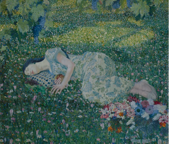 giovane donna addormentata su un prato fiorito - forse la Persefone evocata